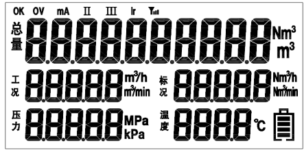 顯示介質(zhì)壓力、溫度、瞬時(shí)流量、累計(jì)標(biāo)準(zhǔn)流量、電池電壓等。