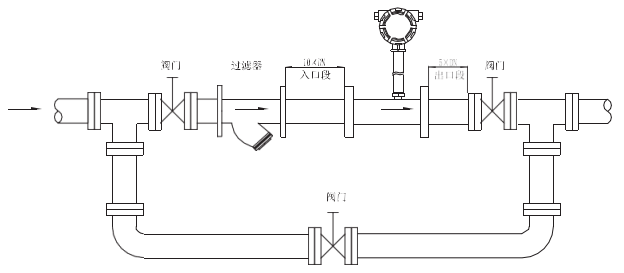 水平安裝傳感器要求管道不應(yīng)有目測可察覺的傾斜(一般在5°以內(nèi)),垂直安裝傳感器管道垂直度偏差亦應(yīng)小于5°。在不能停流的場所,應(yīng)裝旁通管和可靠的截止閥,測量時要確保旁通管無泄漏。