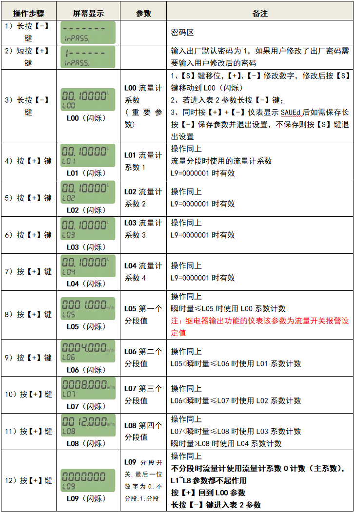 如果不使用流量分段功能,只用一個脈沖當(dāng)量,只需把L09設(shè)為0。此時儀表無論在什么流量下都使用L00作為脈沖當(dāng)量。