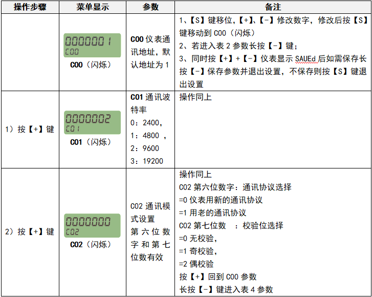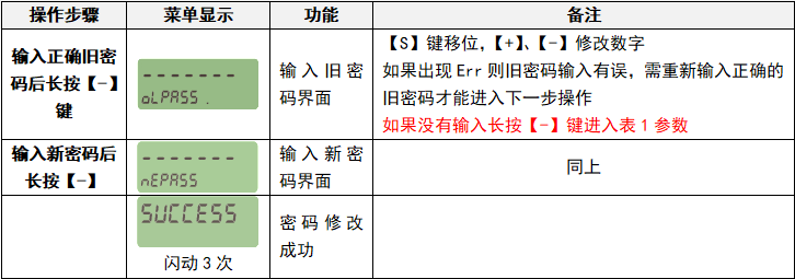 在設(shè)置狀態(tài)下,通過(長按)【-】切換到修改密碼菜單,屏幕上方顯示-------,下方顯示oLPASS時,(短按)【S】,開始輸入儀表密碼出廠密碼(1000000),(長按)【-】確認(rèn),進(jìn)行密碼驗證,正確顯示OH,錯誤顯示Err,如正確顯示OH后,上方顯示-------下方顯示nEPASS時,輸入新密碼(長按)【-】,儀表修改密碼成功顯示SUCCESS閃動,退出設(shè)置返回運(yùn)行狀態(tài)即可。